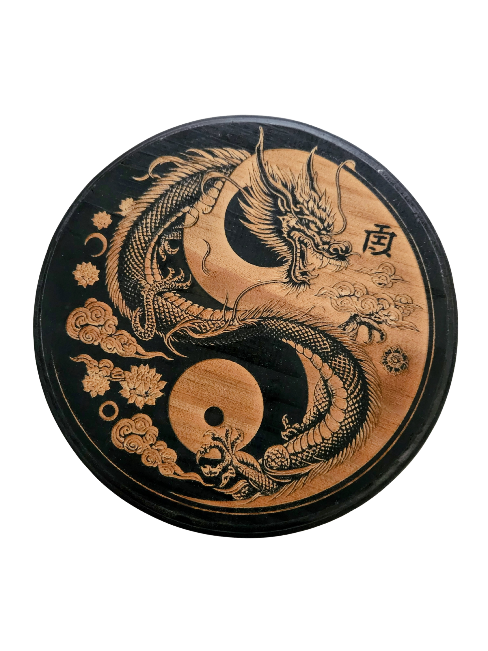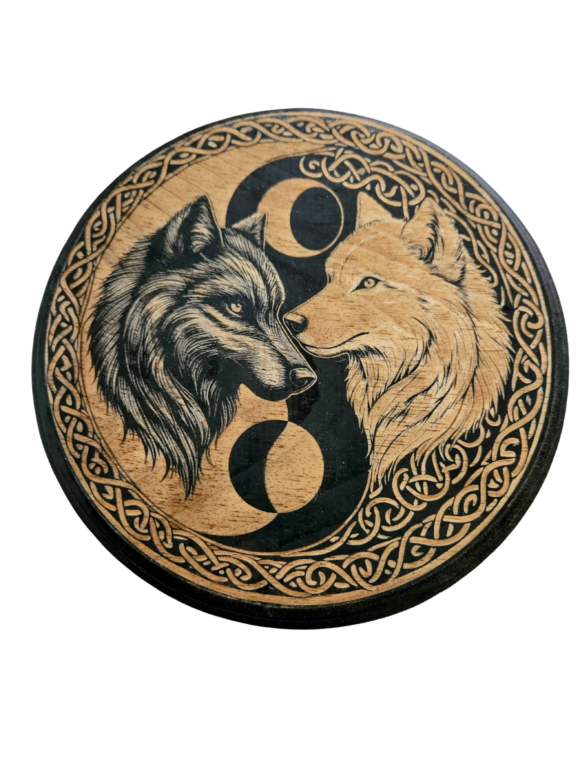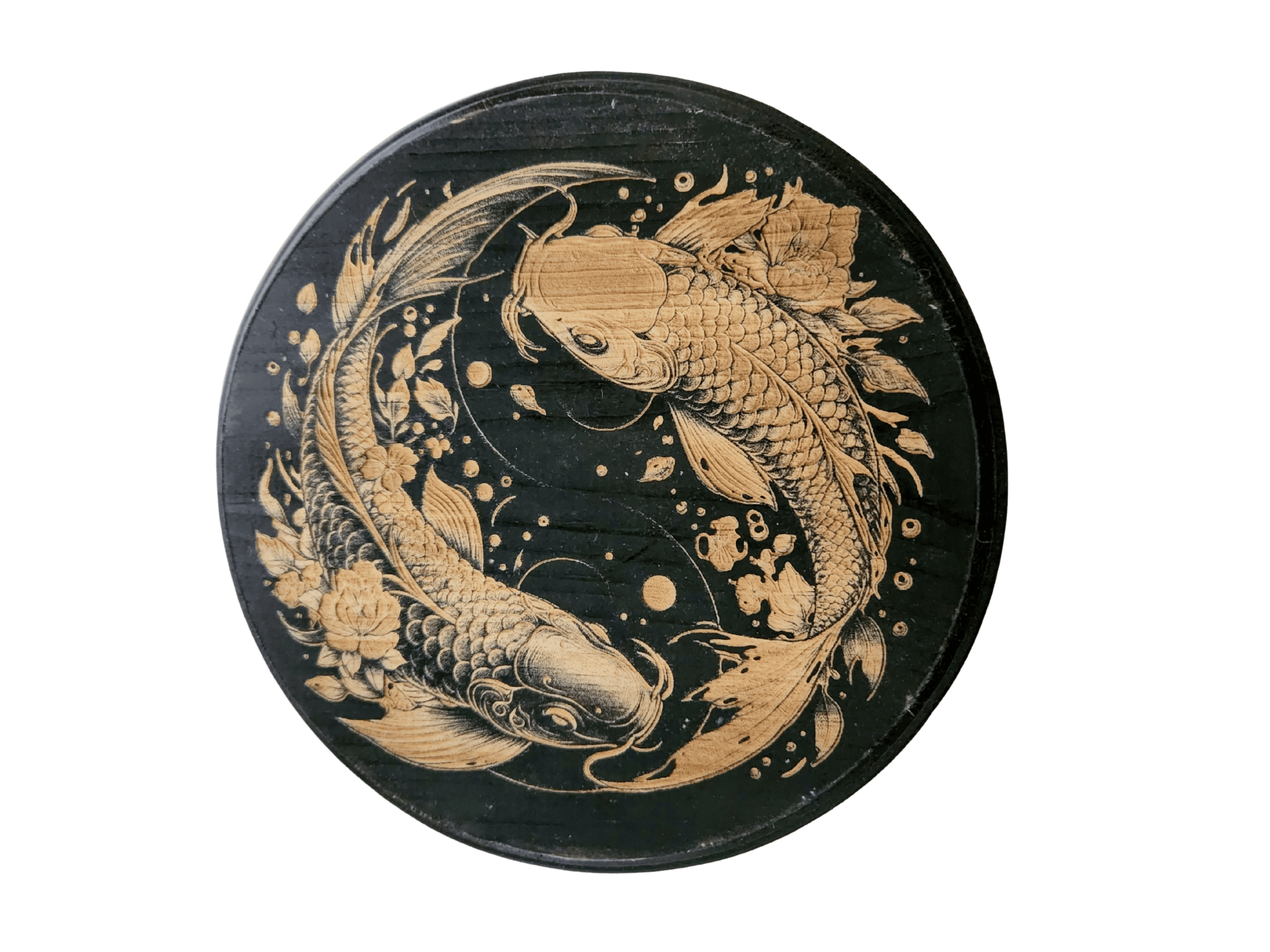 8” round wooden engraving with black painted background, sealed with a gloss finish